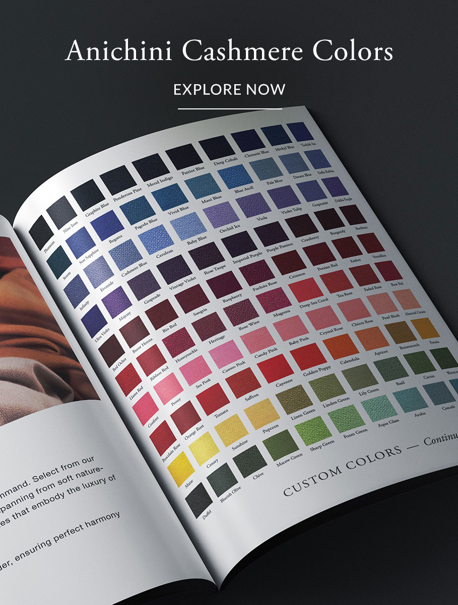 Offering multiple weaves and plys in endless shades, from timeless neutrals to custom-matched Pantone shades. ANICHINI cashmere offers the rare balance of heritage crafstmaship and modern customization. Select from our palette of 160 exquisite shades, or choose your own.