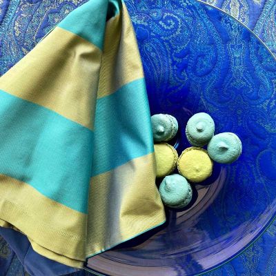 Woven in Italy, from 100% Egyptian cotton sateen, the Scheherazade table linens have a substantial, silky hand. Their dramatic awning stripe design creates an unexpected and over the top table design. Pair them with the coordinating medallion from the Persia Table Linens.